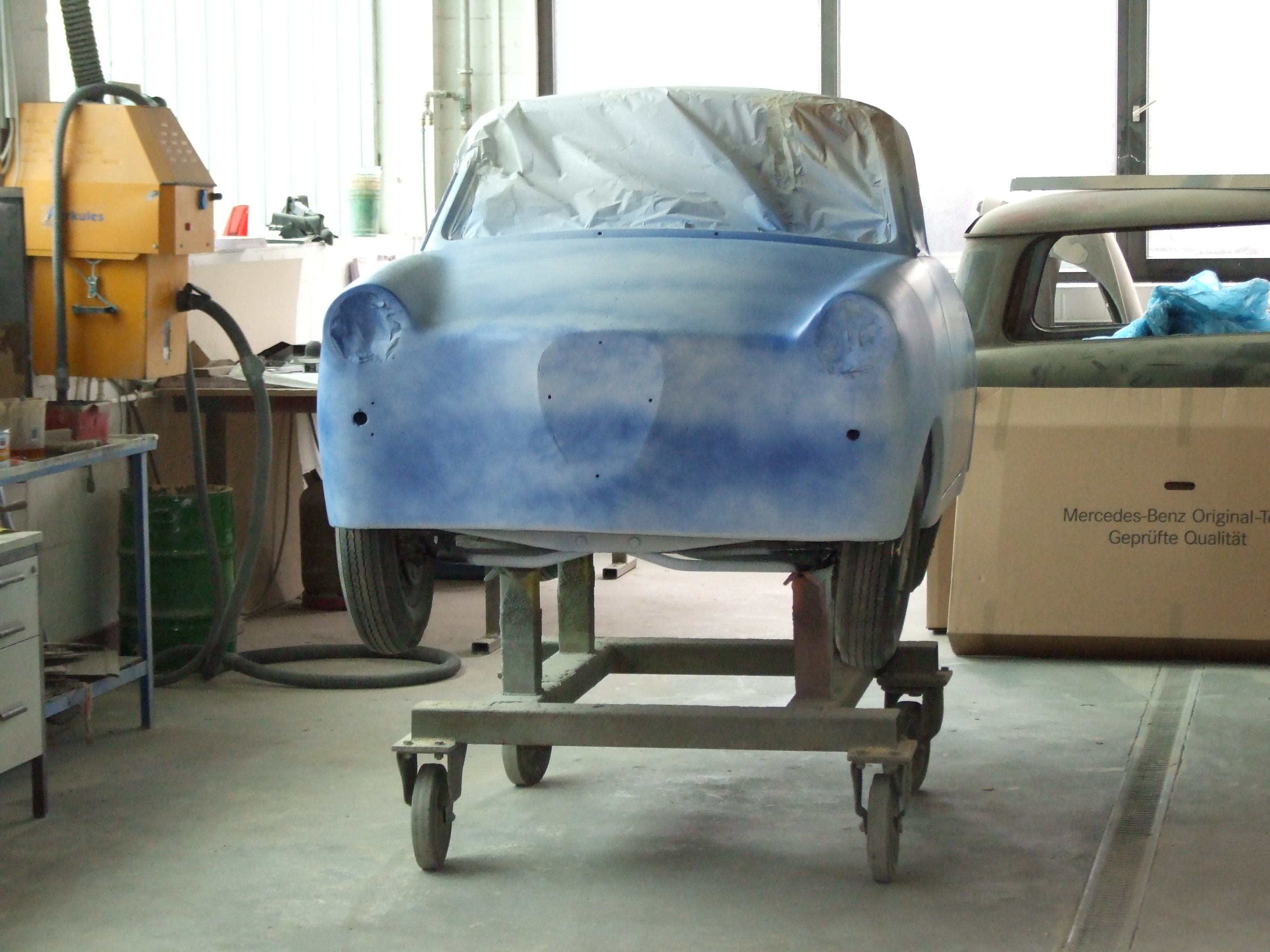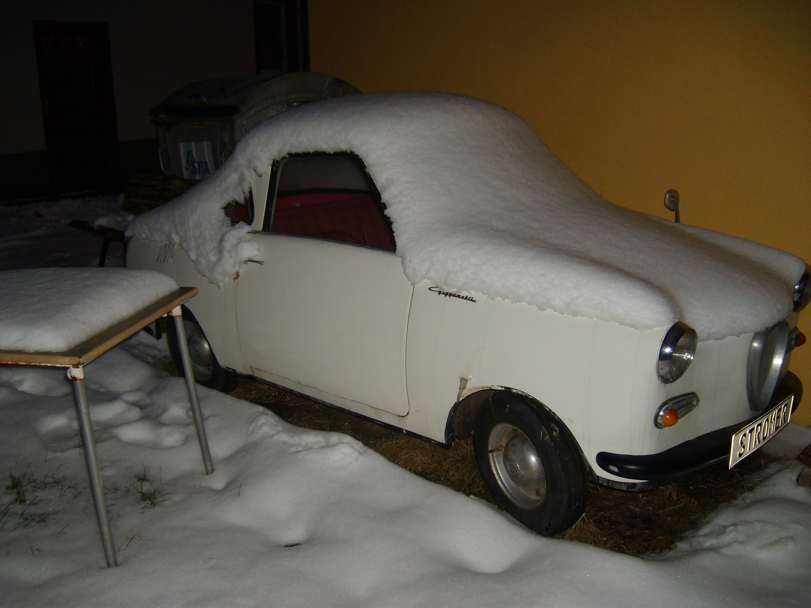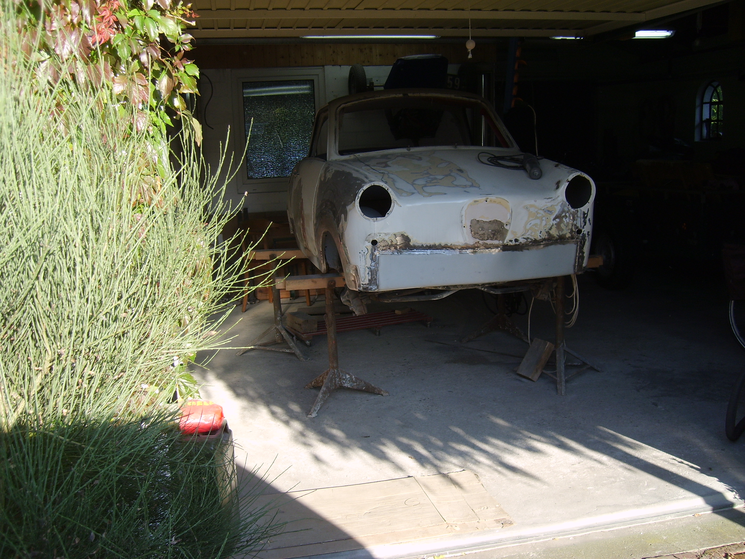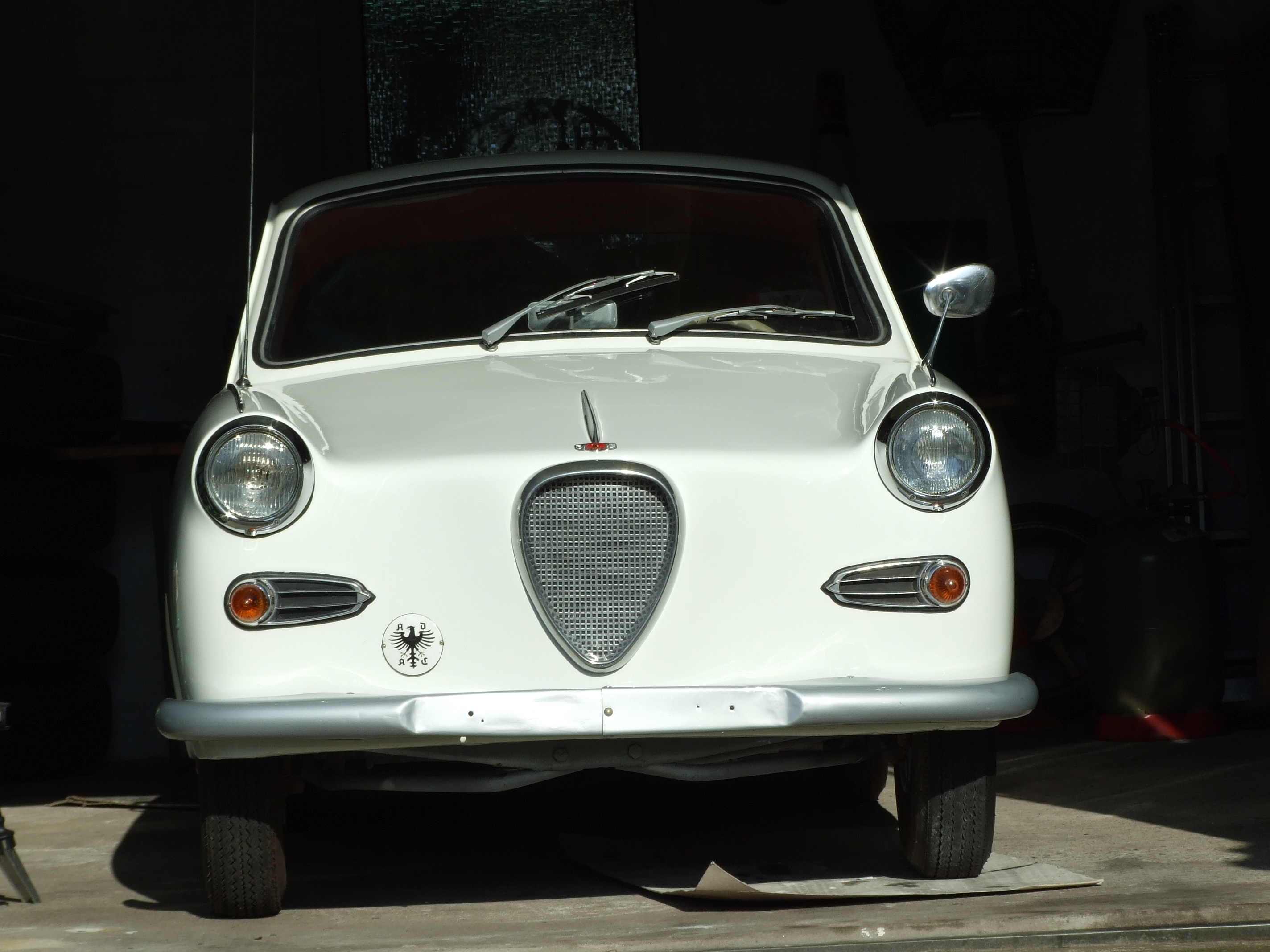 An unserer Loipenstrecke stand das weisse Goggo Coupé und schaute mich an. Es war um mich geschehen. Ich sagte zu Maria: "Man müsste fragen ob der Goggo nicht zu verkaufen wäre." Und zu meinem Erstaunen sagte sie :"Ja,mach doch." Ich habe natürlich gefragt und bekam zur Antwort: "Der Besitzer ist der Wirt der Bahnhofsgaststätte Titisee. Also bin ich Abends zur Bahnhofsgaststätte gelaufen, habe verhandelt und den Goggo gekauft. Der ganze Urlaub bestand nur noch aus Goggo. 14 Tage nach dem Urlaub, es war Karnevalsamstag, bin ich dann mit einem Freund nochmal zum Titisee gefahren und habe den Goggo abgeholt. Der Karnevalsumzug war gerade vorbei, da stand der Goggo bei mir in der Garage. Die sehr aufwendige Restauration, da sehr viel Rost, hat von 2006, mit längeren Pausen, bis 2013 gedauert. Getüvt wurde der Goggo (kein DEKRA) von einem uns bekannten TÜV Angestellten. Schnell angemeldet wurden die ersten Fahrten gemacht. Es macht immer noch sehr viel Spaß mit dem Goggo durch die Gegend zu knattern.